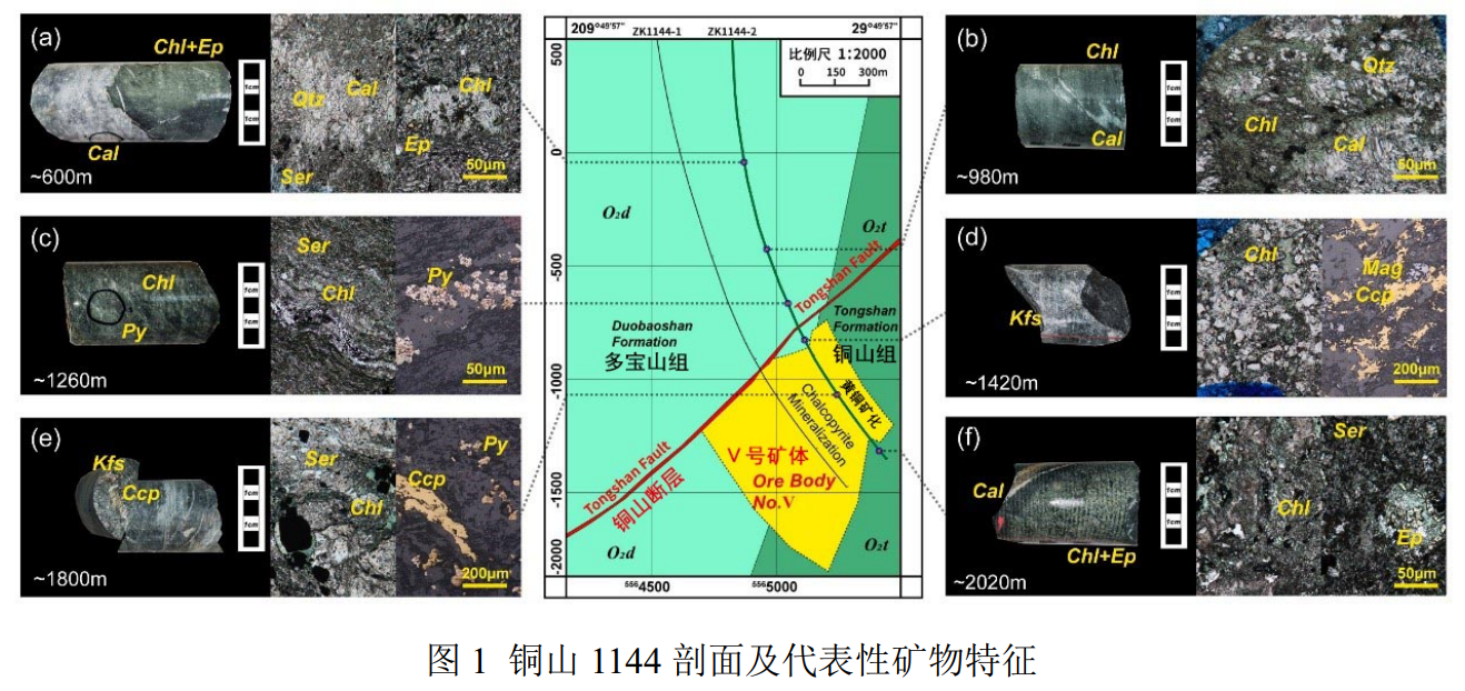 黑龙江多宝山铜矿是世界最古老的斑岩型矿床之一(474.8±4.7Ma),近年来新探明的铜山V号矿体铜储量超200万吨。铜山V号矿体受NW向逆冲退覆的铜山断层控制,矿体勘探工程越过断层即见矿体,同时全孔表现出显著的青磐岩化特征(图1)。然而,勘探工程中并未揭露与之相关的斑岩系统大规模钾化带、热液中心以及被错断的上盘矿体。