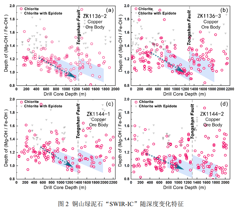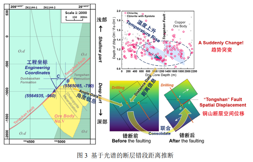 在此基础上,研究团队参考白云母和绿帘石SWIR-IC方案,首次提出绿泥石“SWIR-IC”=Depth(Mg-OH/Fe-OH)参数。我们发现该参数受混入绿帘石比例影响。在排除绿帘石干扰后,绿泥石“SWIR-IC”随深度在断层前后呈现了非常明显的线性下降趋势,并且在断层处发生突变,同时断层前后500米具有类似下降特征(图2)。这很好的反映出温度对绿泥石“SWIR-IC”产生影响。基于上述结果,我们推断铜山铜矿的V号矿体可能发育于斑岩系统中青磐岩化与绢英岩化叠加部位,而热液中心可能位于矿体以下的深部。